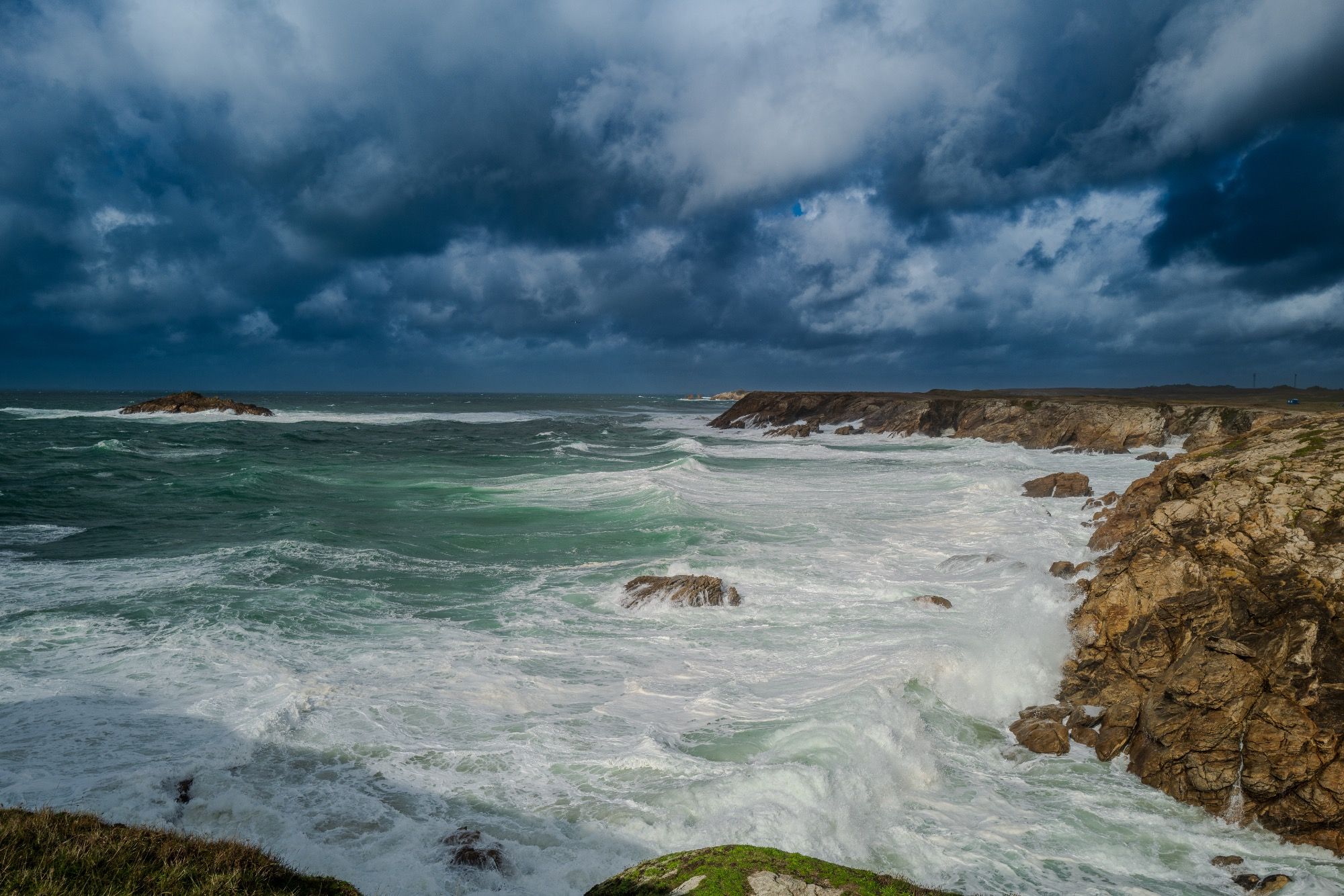 Sur la Côte Sauvage, les tempêtes marines grondent, Un spectacle épique où la nature se répond, Dans ce coin préservé, la Bretagne est un joyau, Où la mer sauvage danse avec un pouvoir nouveau.